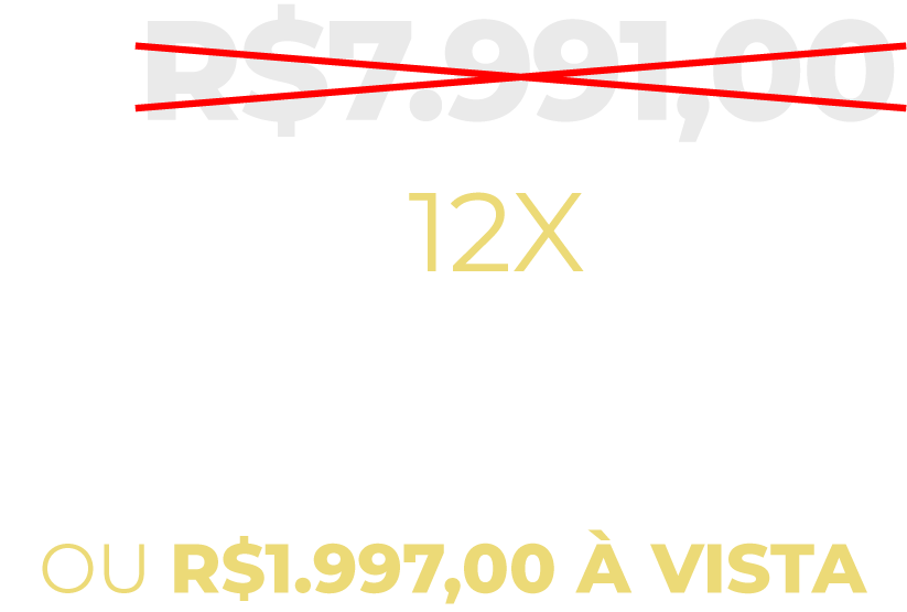 O preço real dos 3 cursos e tudo o que ele oferece hoje é de R$ 7.991,00, mas nós estamos trabalhando nessa turma com um desconto de primeiros alunos. É importante você saber que, para a próxima turma, o preço deve chegar mais perto do valor final.